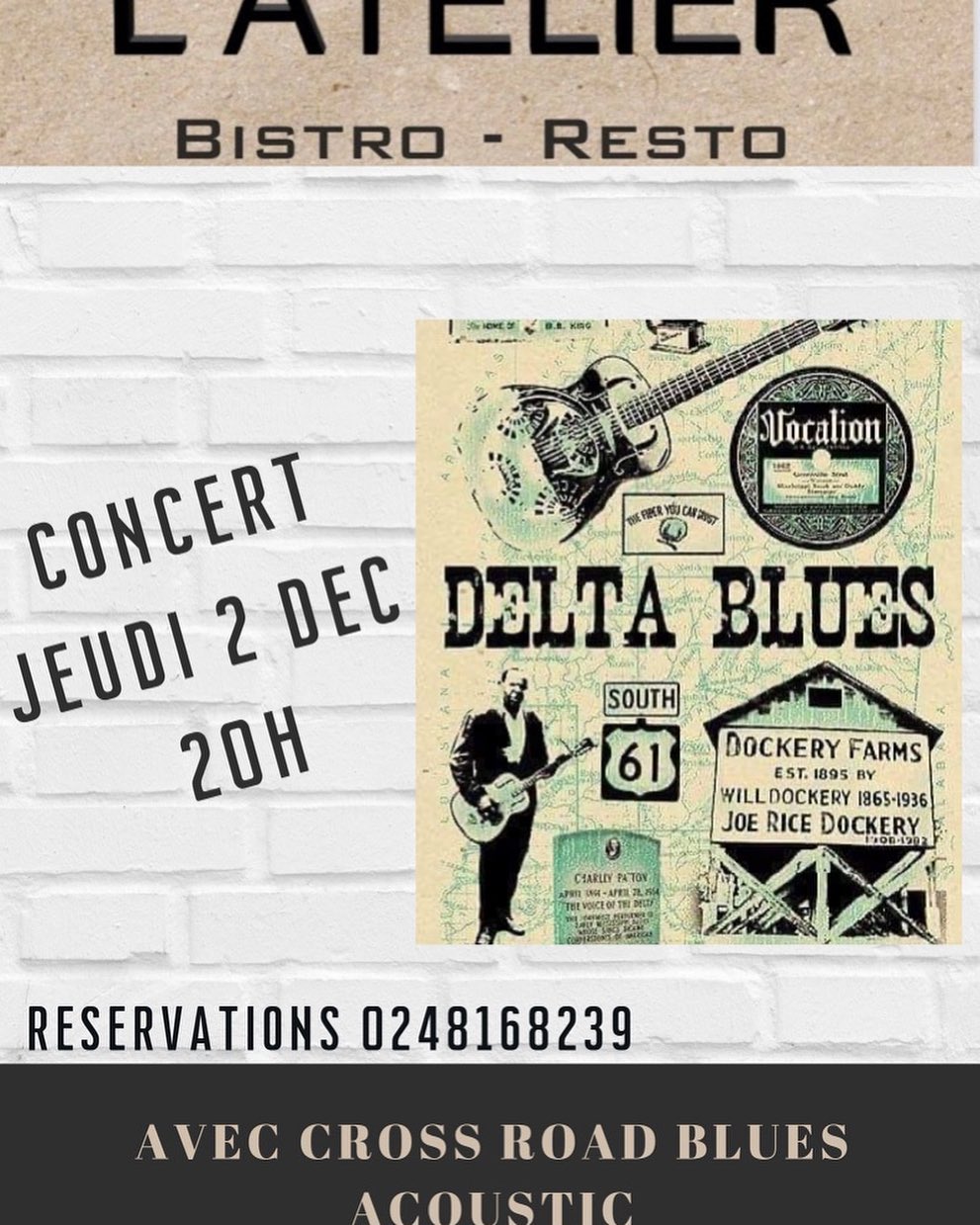 Ce sera à L'ATELIER BISTO de Bourges, qui nous propose un concert de musique blues avec le groupe Cross Road Blues Acoustic.